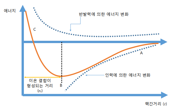 즉, 적당히 핵 간 거리가 떨어져 있는 B 구역에서 이온 결합이 형성되고, 이때가 에너지가 가장 작은 구역입니다. (그래프로 확인 가능합니다)