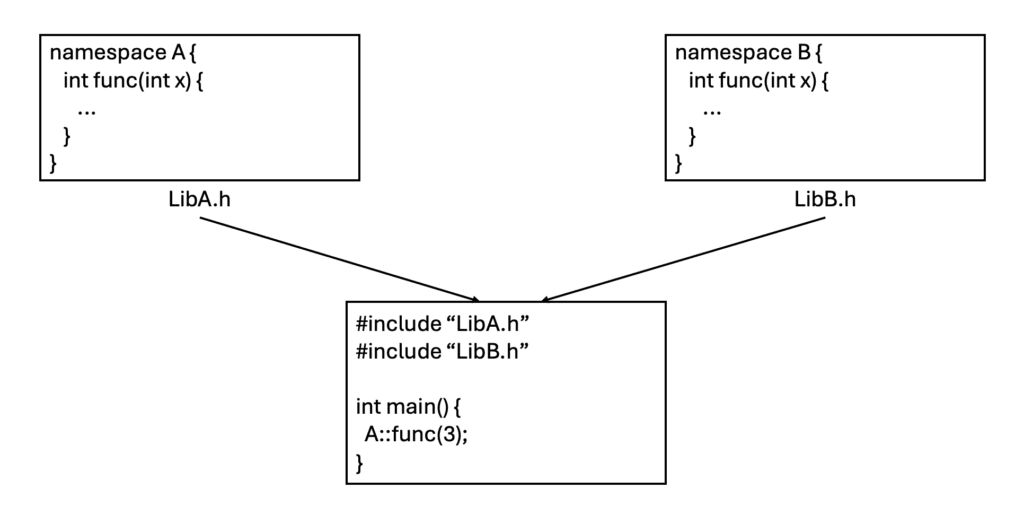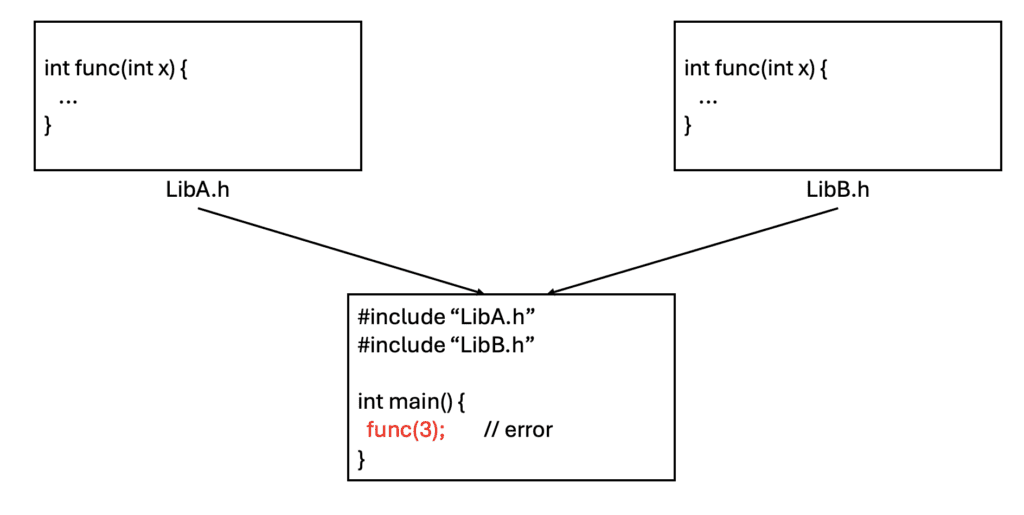 [그림 1]의 경우 func()를 실행할 때, 해당 함수가 LibA의 함수인지 LibB의 함수인지 모호하여 에러를 반환합니다.