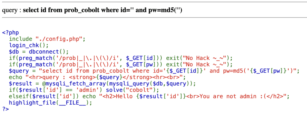 select id from prob_cobolt where id='admin'#' and pw=md5('')