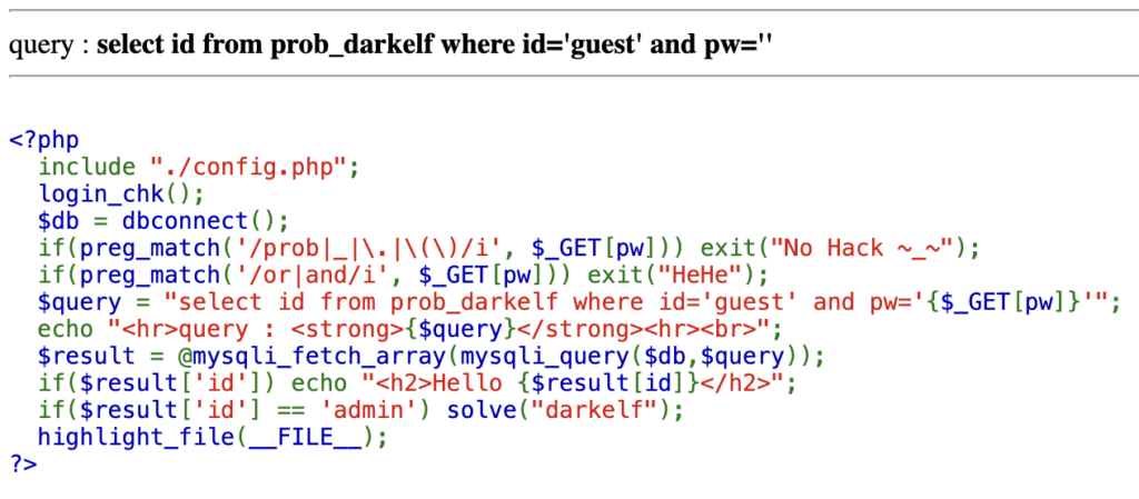 select id from prob_darkelf where id='guest' and pw=''||id='admin'