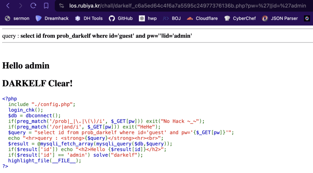 select id from prob_darkelf where id='guest' and pw=''||id='admin'
