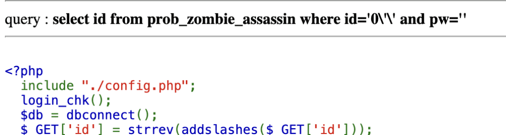 select id from prob_zombie_assassin where id='0\'\' and pw=' or 1#'
