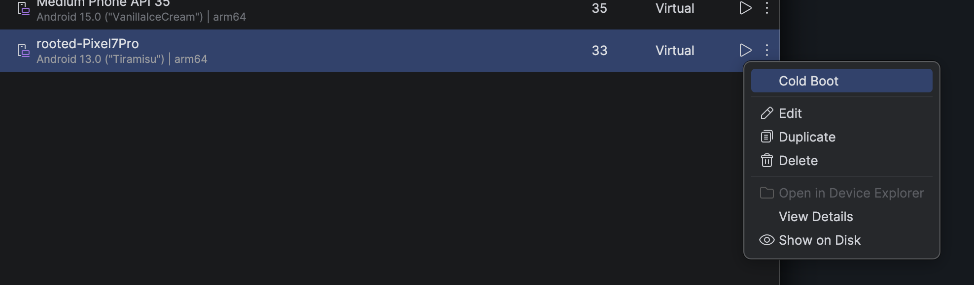 재생버튼 옆 더보기 메뉴를 누른 뒤, Cold Boot를 클릭합니다. (Quick Boot를 사용하지 않을 때 사용합니다.)