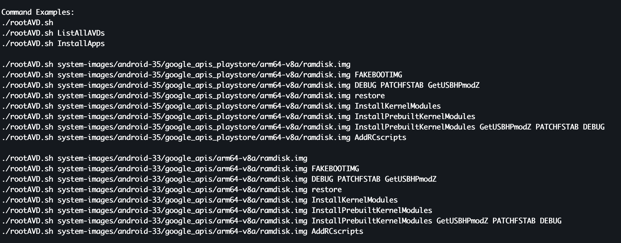 ./rootAVD.sh system-images/android-33/google_apis/arm64-v8a/ramdisk.img