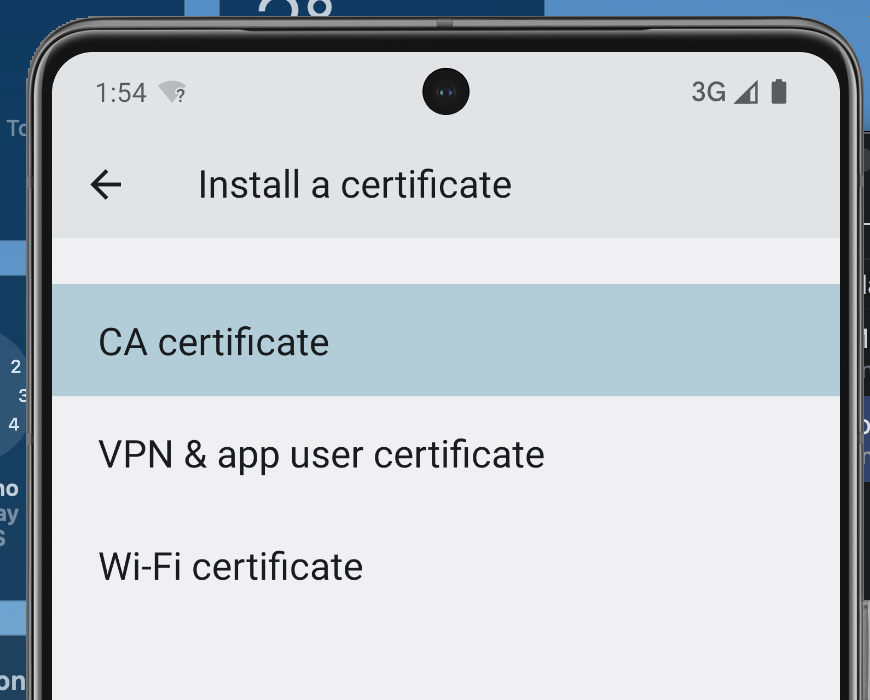 설정에서 CA cert 검색하면 CA 인증서 설치하는 메뉴가 검색될 것입니다.