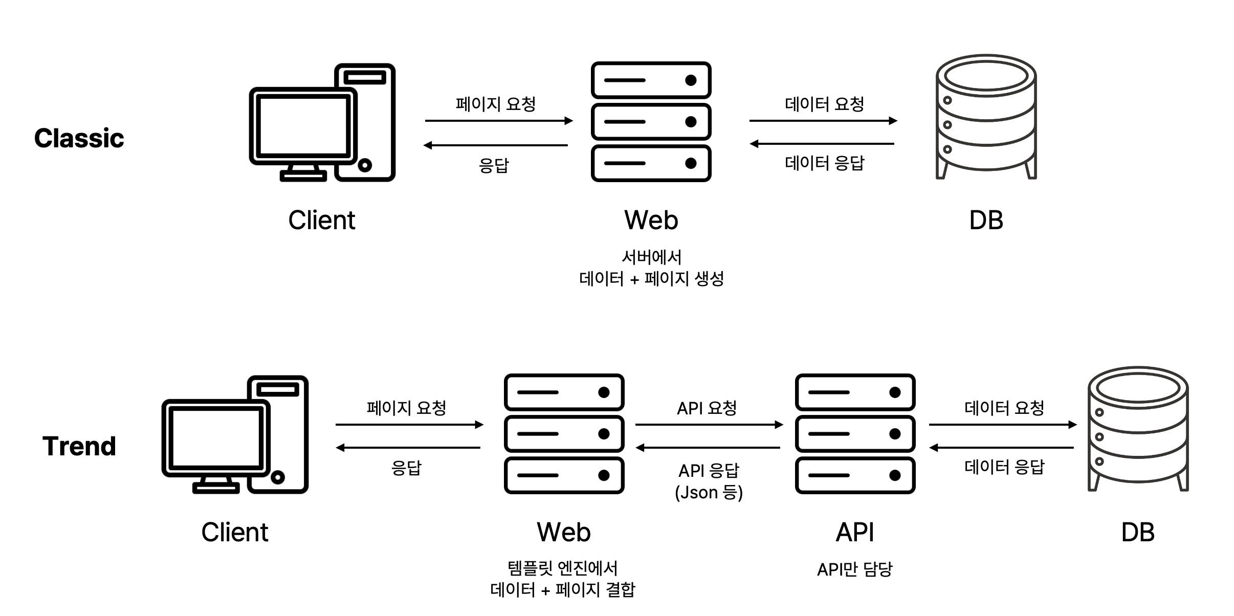 React나 Vue 등의 프론트앤드 프레임워크를 사용함으로써 프론트앤드 서버와 백앤드(API) 서버를 분리할 수 있습니다.