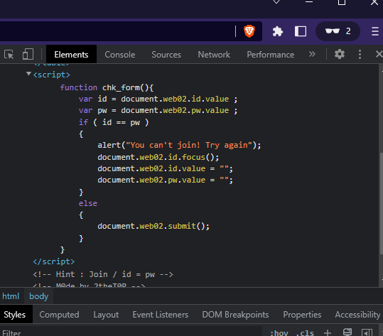해당 힌트에서는 join하려면 ID와 PW가 같으면 된다는데, script에서는 값이 똑같으면 join을 막아버립니다.