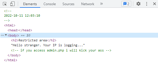 맨 위에 주석은 접속 시간이 기록되어 있고, 아래 주석에는 admin.php 접속하면 걷어찬다고 합니다.