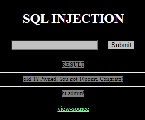 select id from chall18 where id='guest' and no='' or id='admin' and no=2
