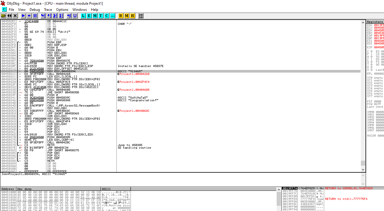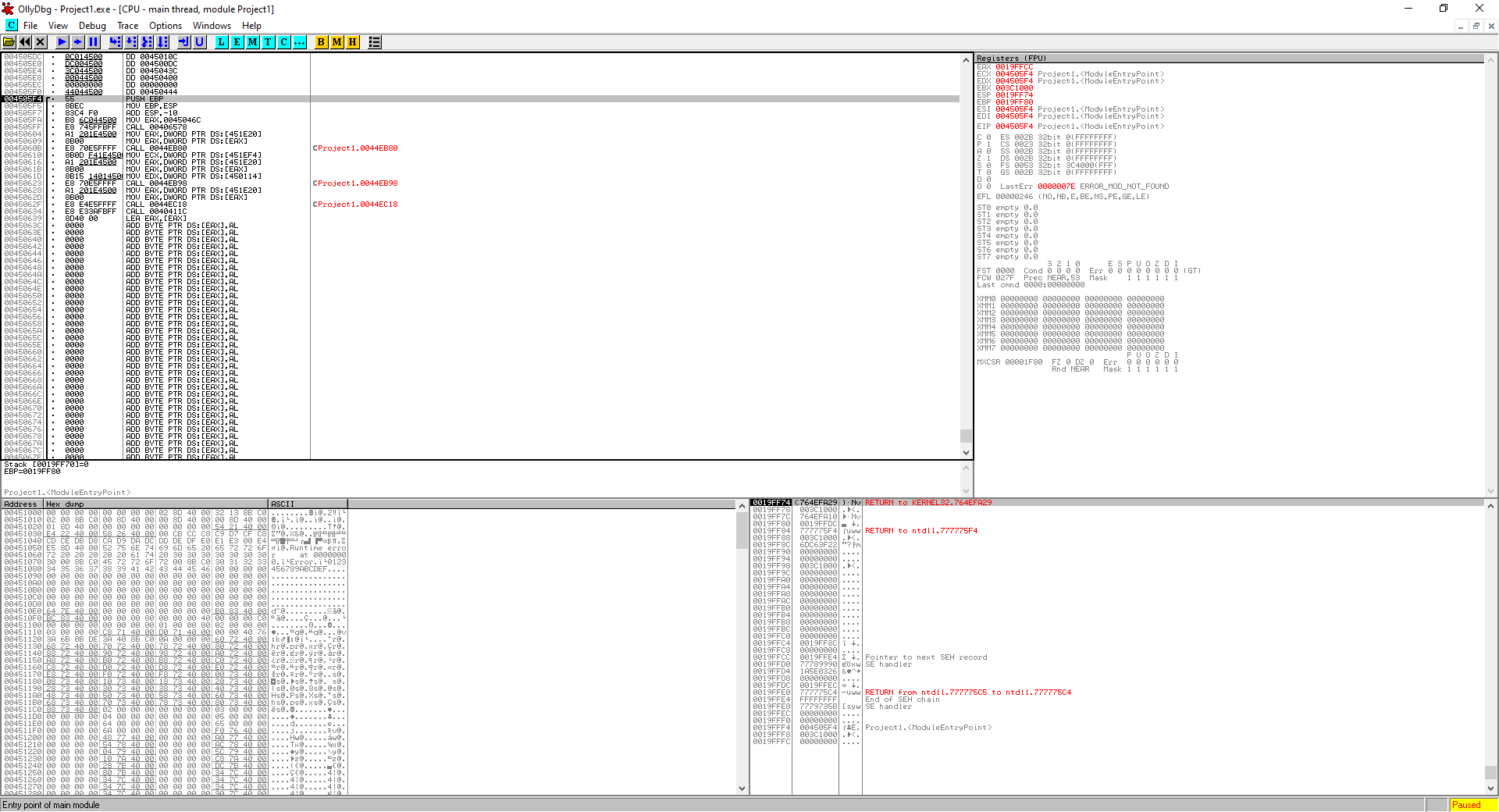 OllyDbg로 Project1.exe를 열어 보았습니다.