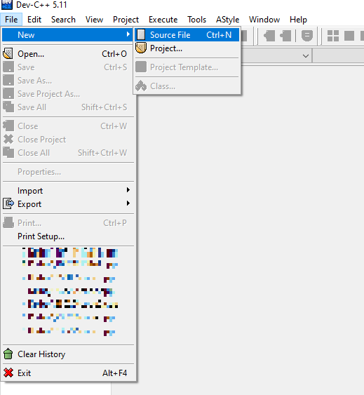 Dev C++ 실행 후 File -> New -> Source File을 클릭하면 새 파일이 생성됩니다.