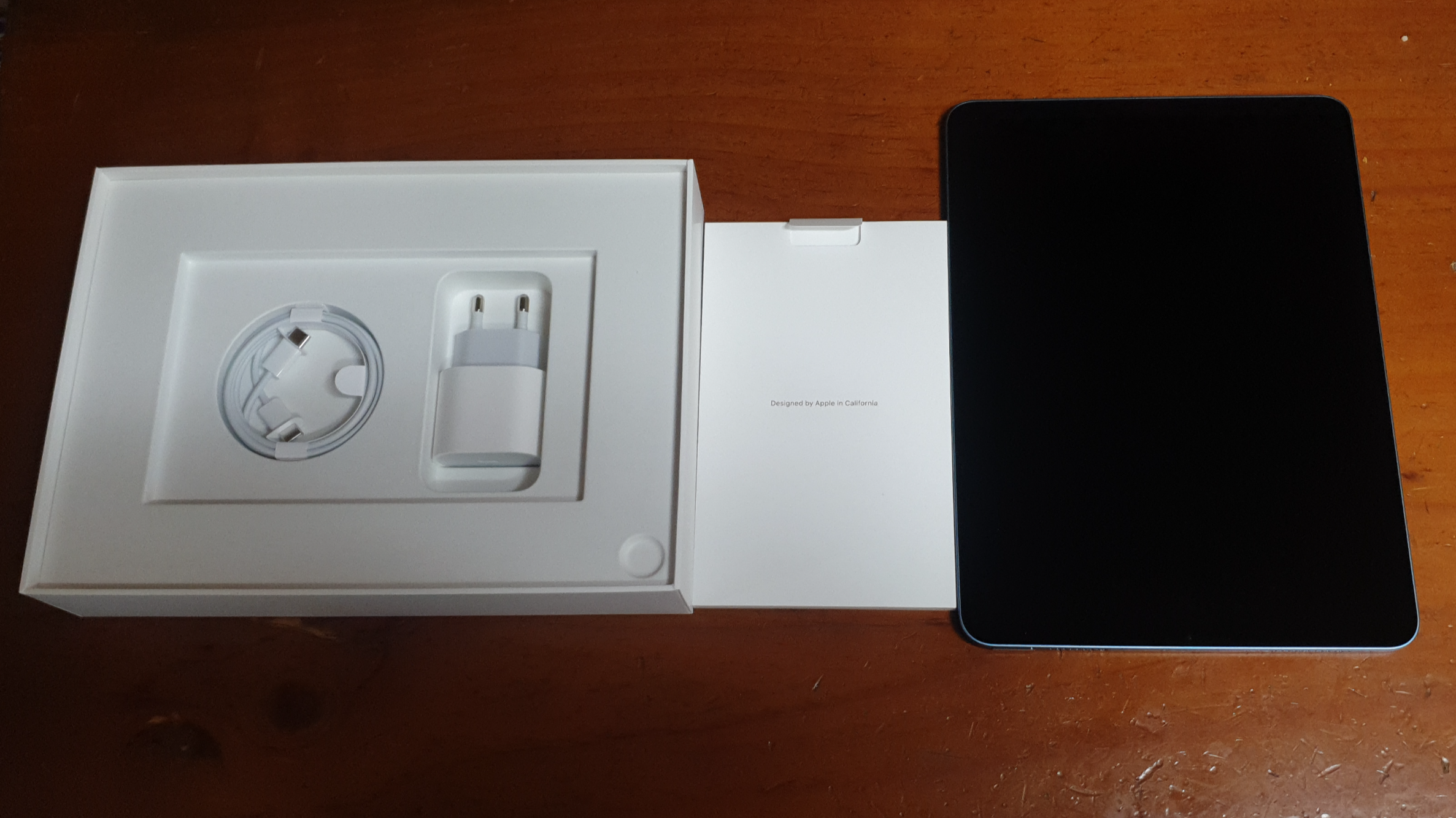 구성품입니다. 충전기, 설명서, iPad 본체입니다.
