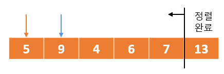 이 때 맨 뒤 부분은 정렬이 완료되었으니, 그 앞 부분까지만 비교하면 됩니다.