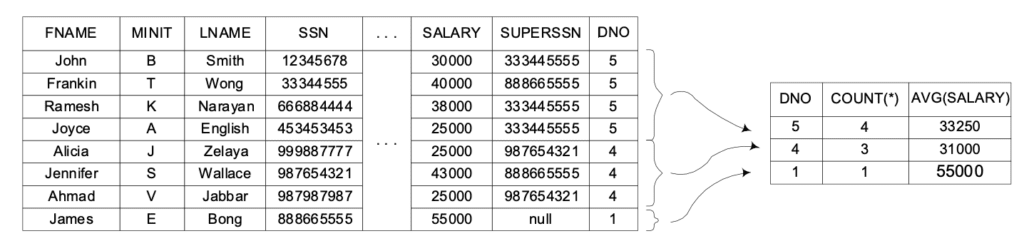DNO를 기준으로 그룹화를 하고, 그룹별로 COUNT와 AVG 연산을 하게 됩니다.